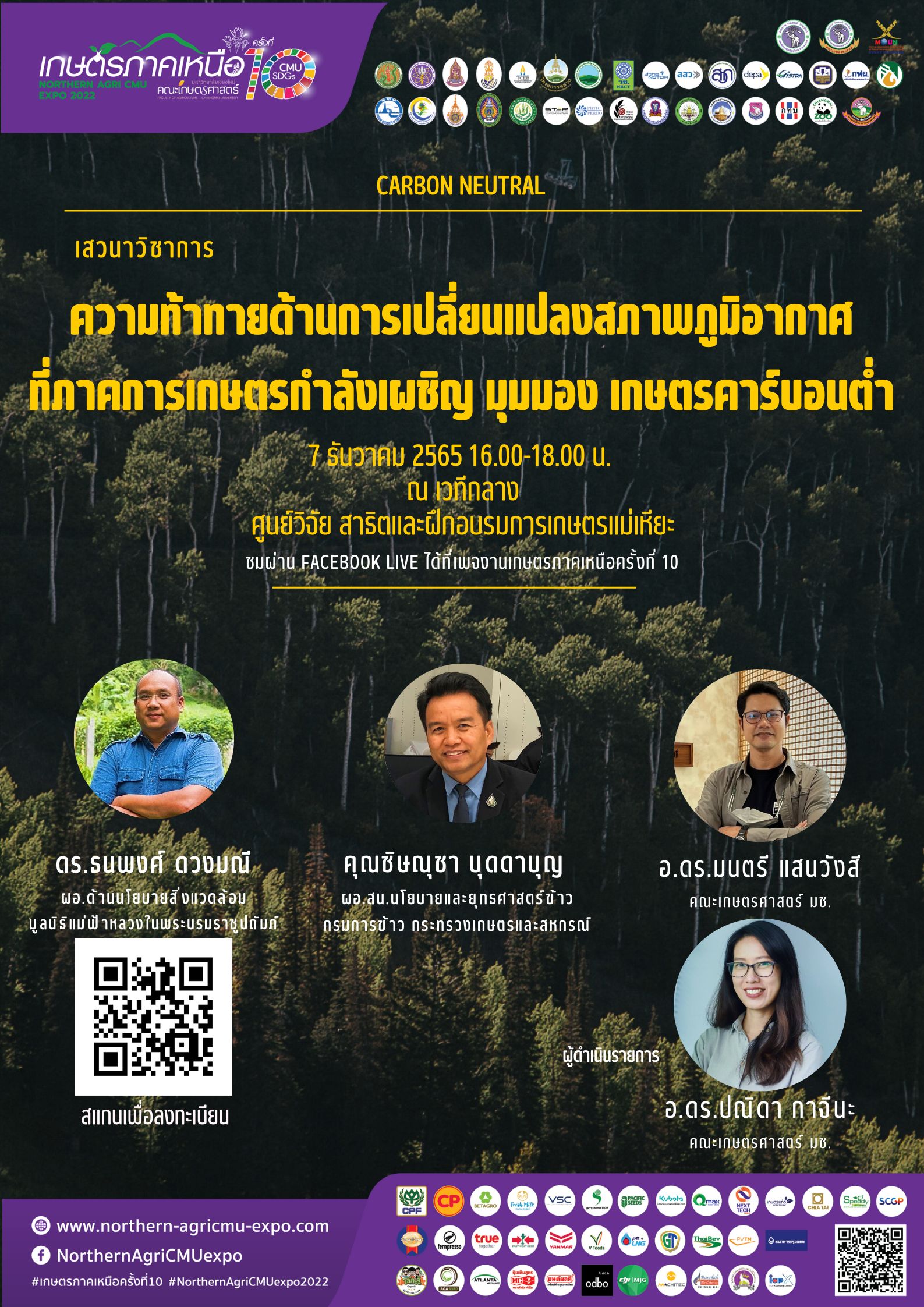 การเปลี่ยนแปลงสภาพภูมิกาศ จะมีผลกระทบกับภาคเกษตรอย่างไรเกษตรคาร์บอนต่ำ คืออะไร สามารถมาหาคำตอบได้ในเสวนาวิชาการ จากผู้เชี่ยวชาญ และมากประสบการณ์ ในหัวข้อ “ความท้าทายด้านการเปลี่ยนแปลงสภาพภูมิอากาศ ที่ภาคการเกษตรกำลังเผชิญ มุมมอง เกษตรคาร์บอนต่ำ” ในวันที่ 7 ธันวาคม 2565 เวลา 16.00-18.00 น. ณ ศูนย์วิจัย สาธิตและฝึกอบรมการเกษตรแม่เหียะ (เวทีกลาง) สแกนลงทะเบียน หรือคลิกที่ลิ้งค์ https://cmu.to/onuZJ หัวข้อเสวนาอื่นๆ https://northern-agricmu-expo.com/activities/seminar/