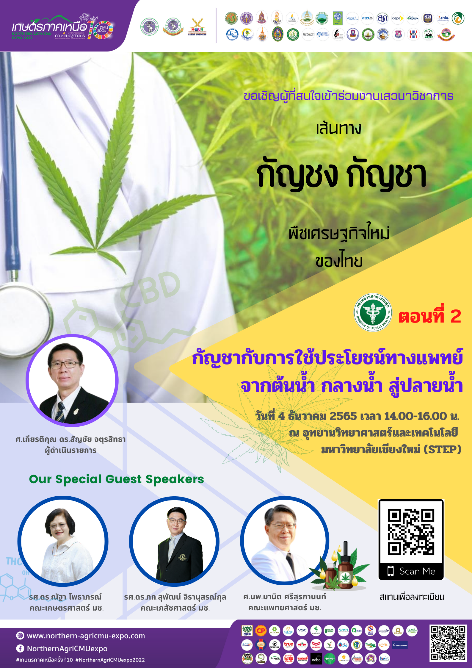 ขอเชิญผู้สนใจเข้าร่วมเสวนาวิชาการ “ธุรกิจกัญชง หลังปลดล็อค แนวทางความเป็นไปได้” ในวันที่ 5 ธันวาคม 2565 เวลา 14.00-16.00 น. ณ อุทยานวิทยาศาสตร์และเทคโนโลยี มหาวิทยาลัยเชียงใหม่ (STEP) สแกนลงทะเบียน หรือ คลิกลิ้งค์ https://cmu.to/8ZoCz หัวข้อเสวนาอื่นๆ https://northern-agricmu-expo.com/activities/seminar/