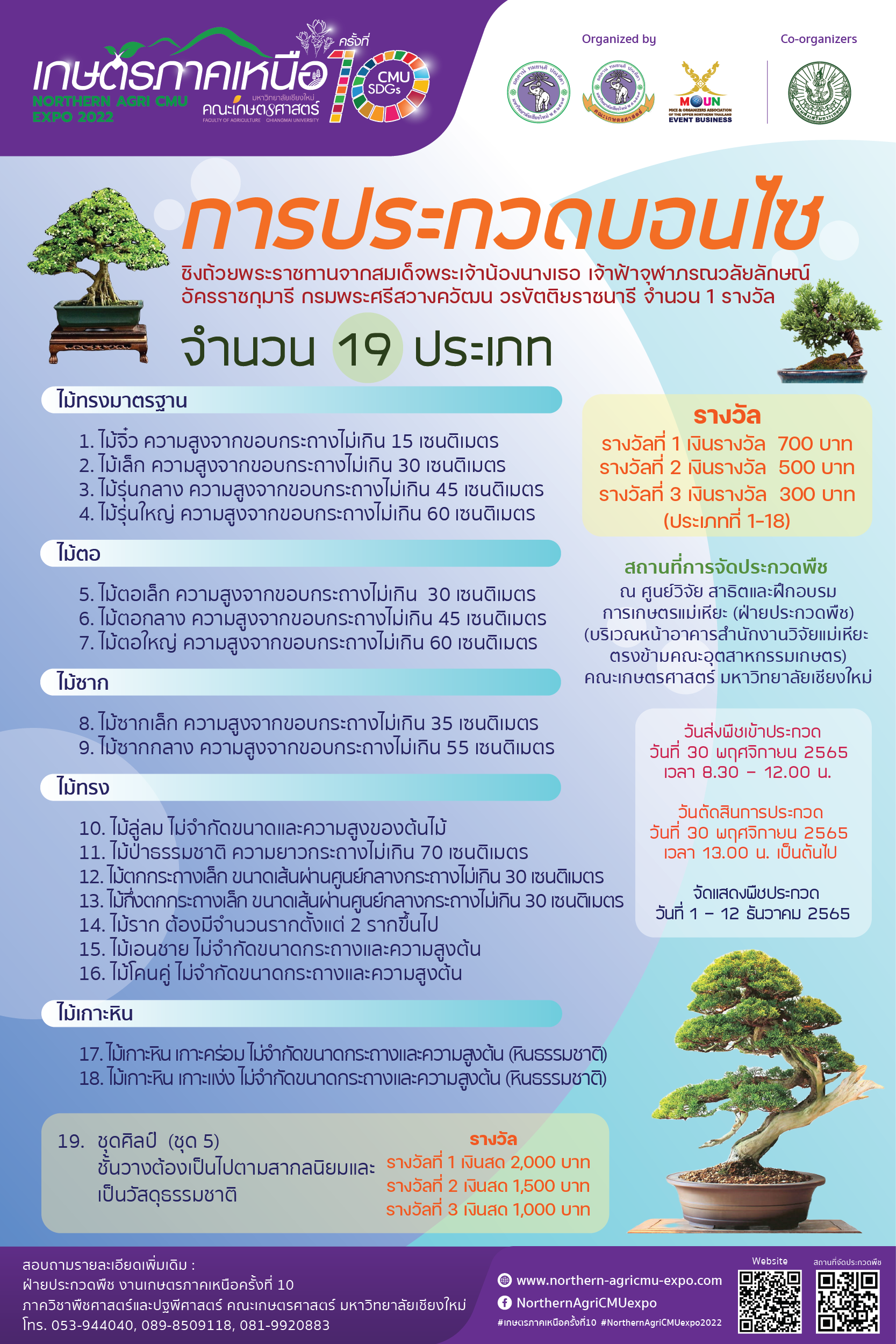 ขอเชิญร่วมประกวดบอนไซ ชิงถ้วยพระราชทานจากสมเด็จพระเจ้าน้องนางเธอ เจ้าฟ้าจุฬาภรณวลัยลักษณ์ อัครราชกุมารี กรมพระศรีสวางควัฒน วรขัตติยราชนารี รายการประกวดจำนวน 19 ประเภท ดังนี้ ไม้ทรงมาตรฐาน1. ไม้จิ๋ว ความสูงจากขอบกระถางไม่เกิน 15 เซนติเมตร2. ไม้เล็ก ความสูงจากขอบกระถางไม่เกิน 30 เซนติเมตร3. ไม้รุ่นกลาง ความสูงจากขอบกระถางไม่เกิน 45 เซนติเมตร4. ไม้รุ่นใหญ่ ความสูงจากขอบกระถางไม่เกิน 60 เซนติเมตรไม้ตอ5. ไม้ตอเล็ก ความสูงจากขอบกระถางไม่เกิน ...
